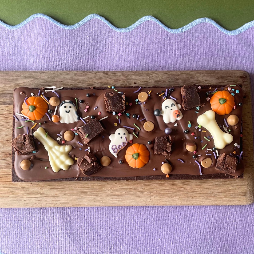 Our classic rich, fudgy chocolate brownie is topped with adorable sugar paste ghosts, a chocolate pumpkin, and spooky bone shaped chocolate. Finished with a sprinkle of vibrant Halloween-coloured sprinkles, this treat is perfect for sharing (or keeping all to yourself!) full of creepy, crunchy, and gooey fun in every bite!